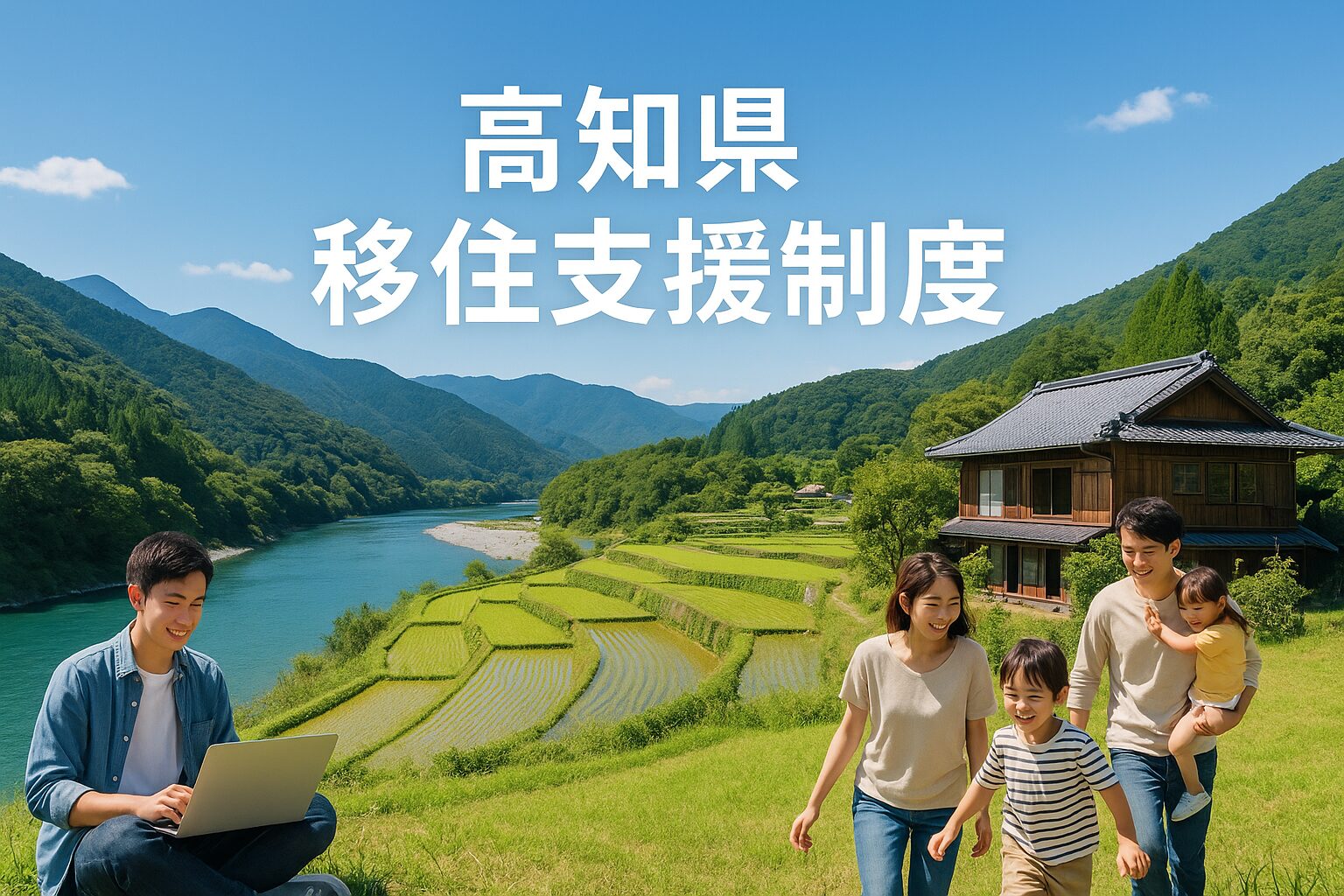 高知県の山・川・海が広がる自然風景の中で、古民家や棚田、リモートワークをする若者、家族で暮らす人々が調和した、移住支援制度を象徴する温かみのある横長バナー画像。キャプションには『高知県 移住支援制度』の文字入り。